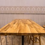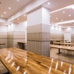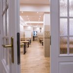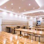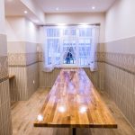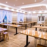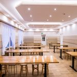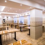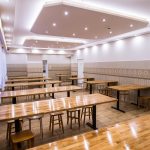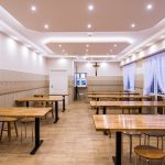 Szerokie, podwójne, przeszklone drzwi prowadzą do jadalni, która robi na przybyłych jeszcze większe wrażenie, niż hall. Wrażenie to jest szczególnie mocne w przypadku osób pamiętających to miejsce z czasów przedremontowych. A więc znowu gładkie, regipsowe ściany i niezbędna ze względów praktycznych kafelkowa lamperia. Wszystko połączone w jeden spójny projekt, którego nie powstydziłyby się znane z telewizji urządzające was Doroty i Katarzyny. Pięknie prezentują się nowe stoły, których grube blaty, złożone z wielu drewnianych elementów o różnych odcieniach, wsparto na czarnych, matowych nogach. Każdy z nich można przenieść lub ustawić inaczej, teraz jednak optymalnie wypełniają przestrzeń jadalni, powiększoną dzięki likwidacji szatni, wąskiego korytarzyka i pomieszczenia gospodarczego. Oświetlenie umieszczone w podwieszanych elementach sufitu dodaje ciepła wnętrzu, podobnie jak śnieżnobiałe, muślinowe firanki, upięte na oknach. Jak zdradziła para diecezjalna, gdy w sobotę wieszano firanki, przeciwległe ściany wciąż jeszcze były mokre od świeżo nakładanej farby.