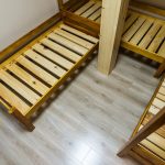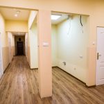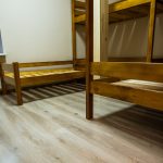 Po wejściu na piętro czekają nas kolejne odsłony remontowych zmian. A wiec znowu spory hall, a w nim gładkie ściany i stonowane oświetlenie. Na podłodze nie ma brzydko lakierowanych, skrzypiących desek, zastąpiono je panelami. Jeszcze nie wszystkie prace zostały zakończone. Po wychodzących ze ścian końcówkach przewodów i rur można się domyślić, że zostanie tu stworzony aneks kuchenny. Rozwiązanie bardzo praktyczne i wręcz niezbędne dla nocujących w ośrodku rodzin, szczególnie tych z małymi dziećmi. W pełni wykończona jest natomiast wspólna dla piętra łazienka. Jest ona jedynie uzupełnieniem tych znajdujących się w pokojach.